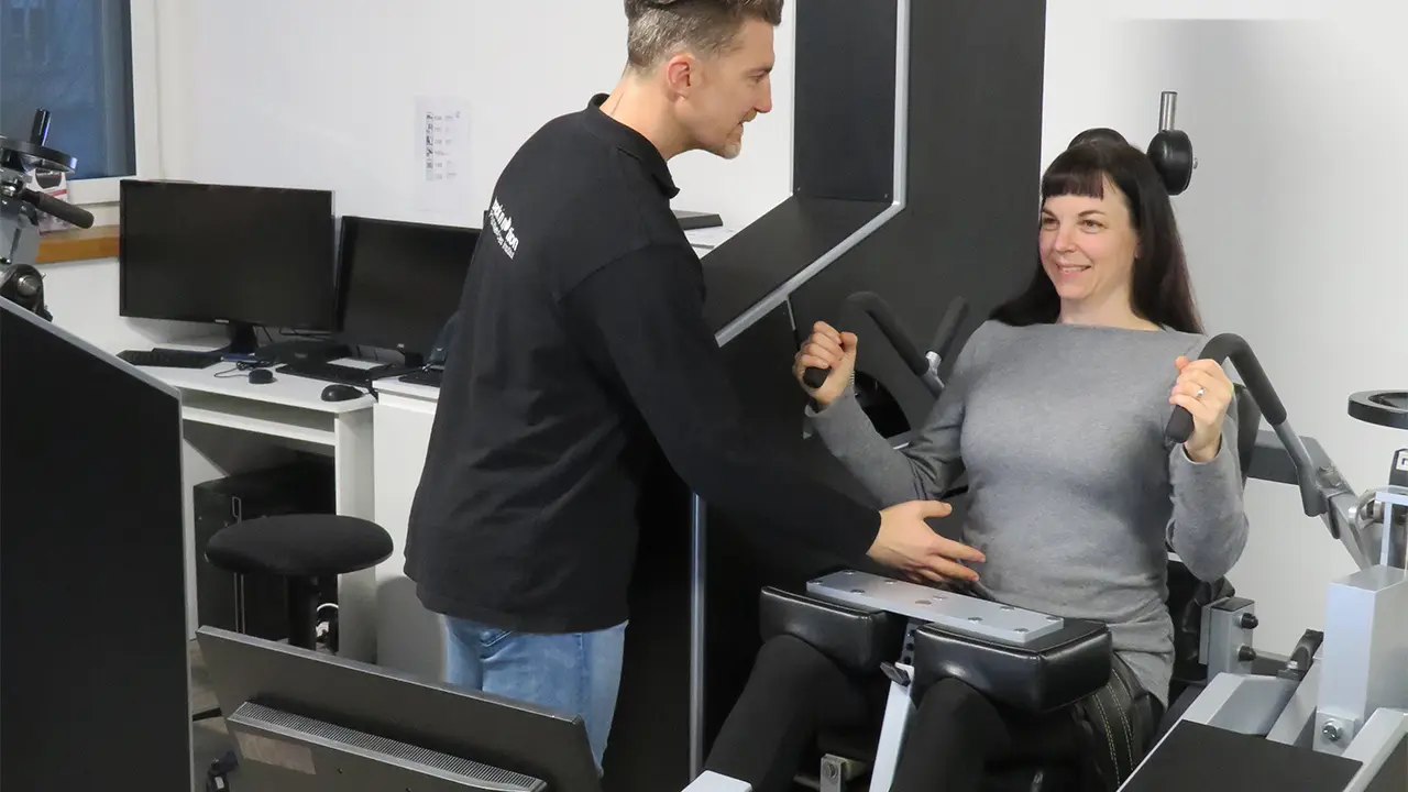 Medizinisches Personal Training an hochspezifischen Geräten für die Lenden- und Halswirbelsäulenmuskulatur